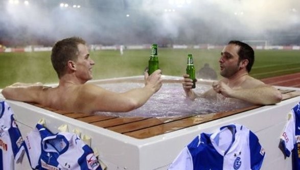 Për të kompletuar “paketën” e ofruar nga klubi, lojtarët kanë shkuar të festojnë fitoren pikërisht në vaskën pranë fushës.
