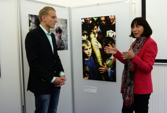 Europaministerin Marion Walsmann besichtigte die Ausstellung und ließ sich von Adrian Weickart die Geschichten hinter den Fotos erzählen.