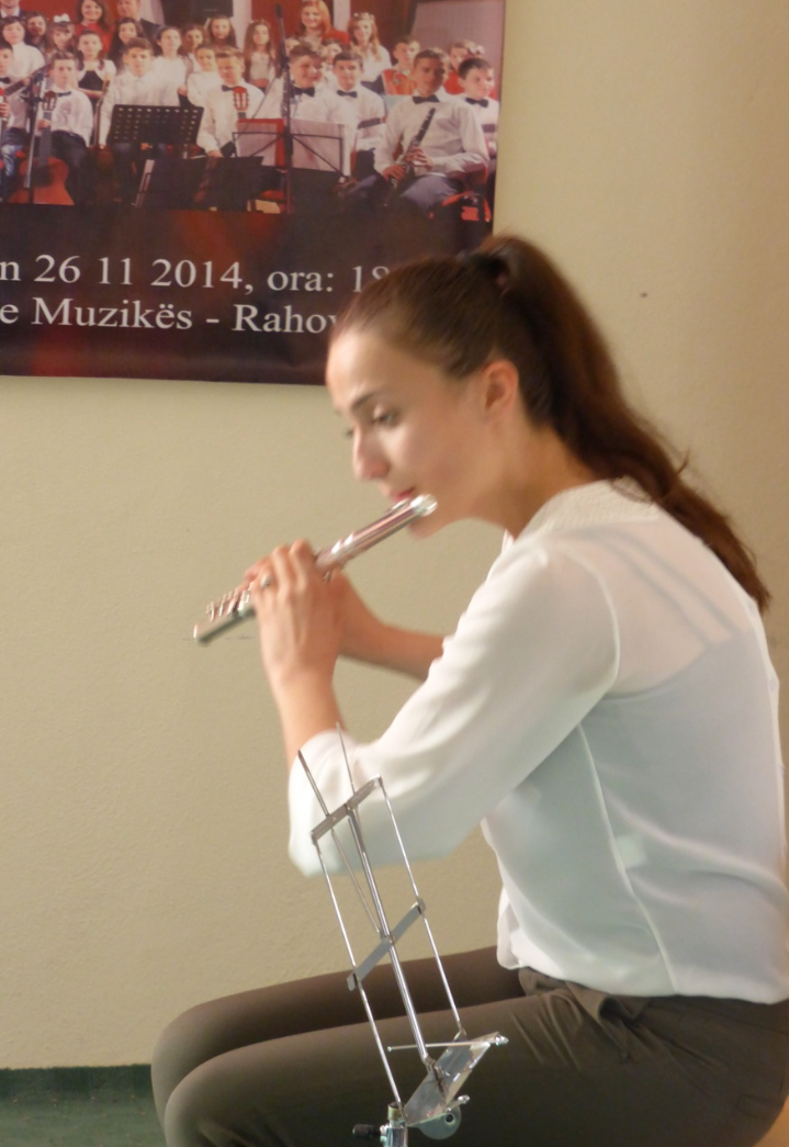 Die beiden jungen Frauen kommen aus einer Familie mit einem Musikliebhaber als Vater, doch Musikunterricht konnte keiner der beiden Männer besuchen. Jeta sang schon als kleines Kind sehr gerne und so liessen die Eltern sie in der Primarschule im Kinderchor in Gjakova mitsingen, den Astrit Pallasku, damals auch Direktor der Musikschule, leitet. Jeta trat nach einiger Zeit wie Kaltrina in die Unterstufe der Musikschule ein, und als die Schule dank der Unterstützung von Dorothea Fankhauser neue Instrumente erhielt, wählte sie die Querflöte. „Ich hatte keine Ahnung, was das für ein Instrument ist, aber meine Schwester spielte Geige und so entschied ich mich für die Flöte“, erzählt sie lachend. „Bevor ich in die Oberstufe kam, war ich nicht sicher, ob ich ins Gymnasium wollte, oder in der Musikschule bleiben sollte.“ Doch Jeta konnte in vielen Konzertprojekten mitmachen, die ihr Spass machten, und so entschied sie sich für die Oberstufe der Musikschule. Von da an war auch klar, dass sie Musik zu ihrem Beruf machen wollte. Die Aufnahmeprüfung an die Hochschule für Musik war für sie und für Kaltrina keine grosse Hürde nach der guten Vorbereitung in Gjakova. Beide sind sie nun im zweiten Studienjahr in Pristina und haben schon viel Orchestererfahrung.
