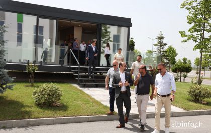 Eine Gruppe von albanisch-schweizerischen Persönlichkeiten, darunter Unternehmer, Ärzte und Bankiers, begleitet...