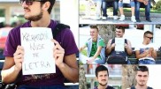 Einige junge Leute in Kosova zeigen des Slogan „Suche Braut...
