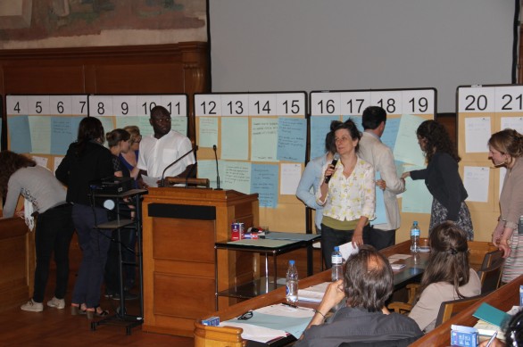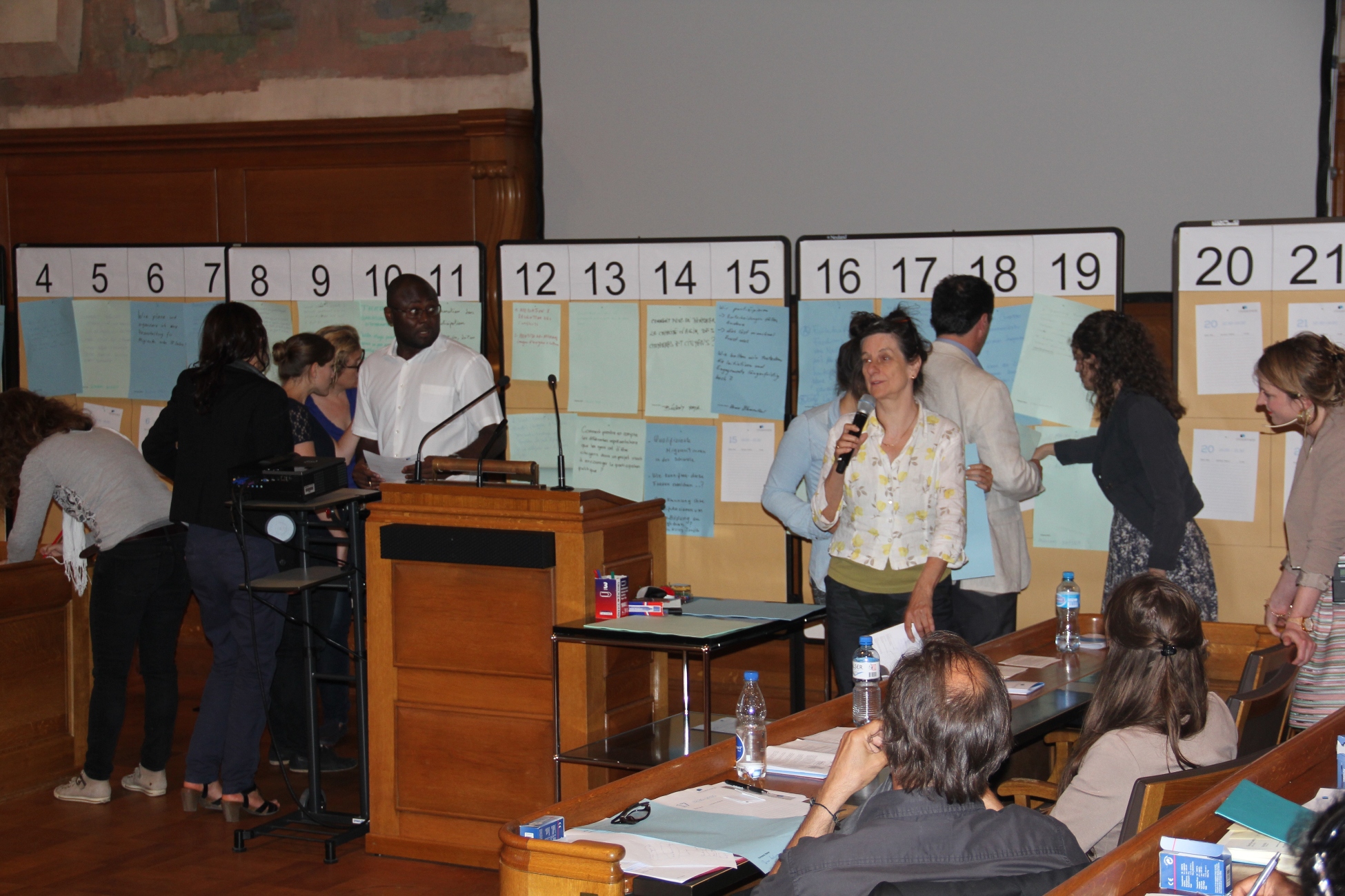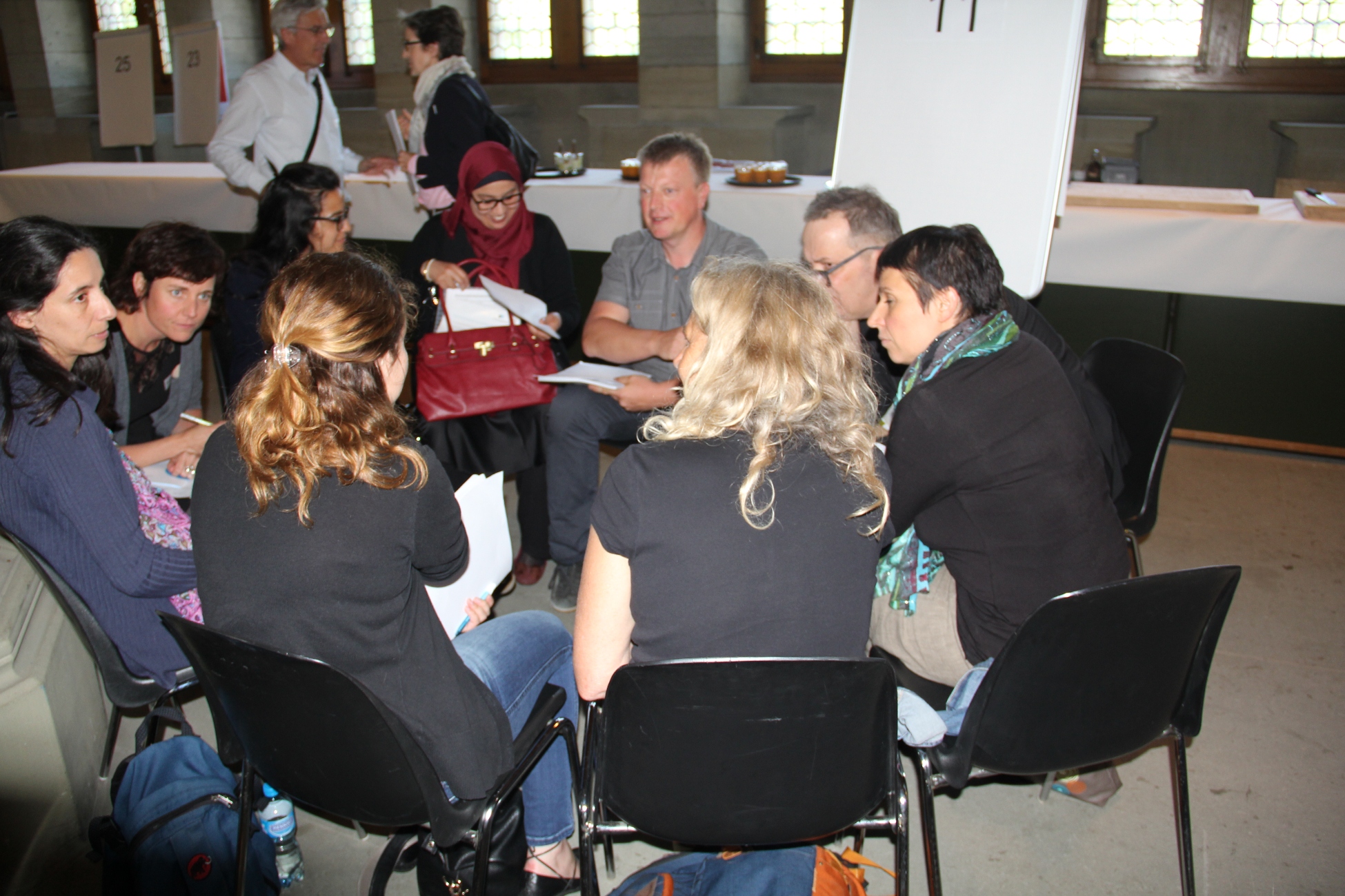 “Open Space” heisst eine neue Methode zur Durchführung von Workshops, die an diesem Praxistag erstmals zur Anwendung kam. Sie besteht darin, Themen und Anliegen von möglichst vielen Teilnehmern zu sammeln und diese anschliessend in Gruppen zu bearbeiten. So wurden Probleme zu Alltag, Migration, politischer und gesellschaftlicher Teilnahme usw. gruppenweise behandelt und die Ergebnisse bildeten anschliessend einen Teil der Schlussfolgerungen der Veranstaltung und Grundlage zur Realisierung neuer Projekte etc.