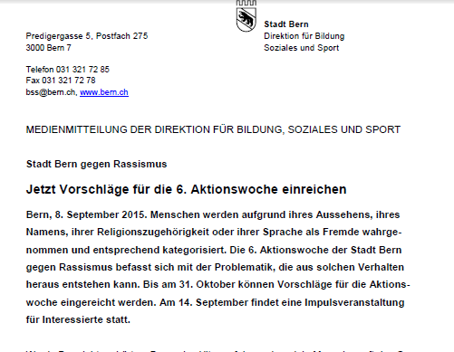Im Anhang senden wir Ihnen die Ausschreibungsunterlagen zur Aktionswoche sowie die entsprechende Medienmitteilung, die heute publiziert wurde. Weitere Informationen und alle Unterlagen finden Sie auch auf www.berngegenrassismus.ch.