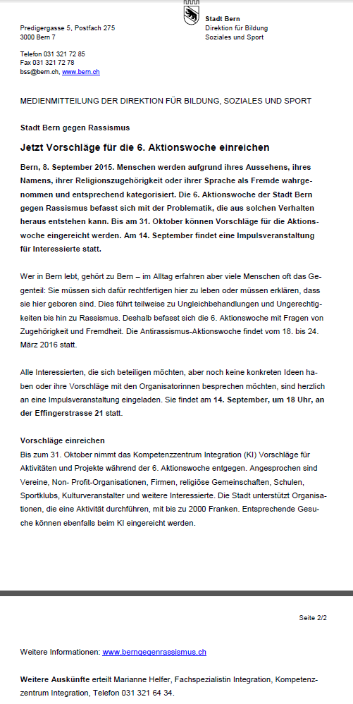 Im Anhang senden wir Ihnen die Ausschreibungsunterlagen zur Aktionswoche sowie die entsprechende Medienmitteilung, die heute publiziert wurde. Weitere Informationen und alle Unterlagen finden Sie auch auf www.berngegenrassismus.ch.