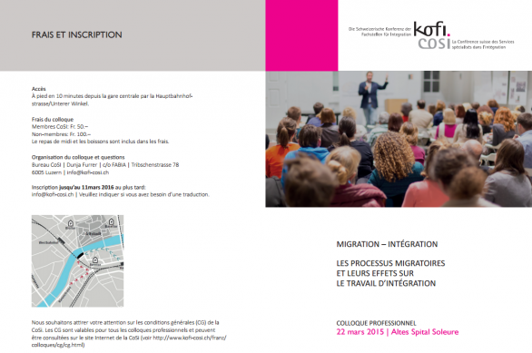Nous avons le plaisir de vous inviter au prochain colloque professionnel de la « Conférence suisse des Services spécialisés dans l’intégration – CoSI » qui aura lieu le22 mars 2016. Nous vous remercions de l’intérêt porté à ce thème.