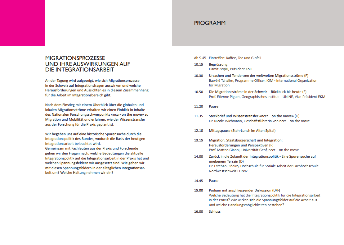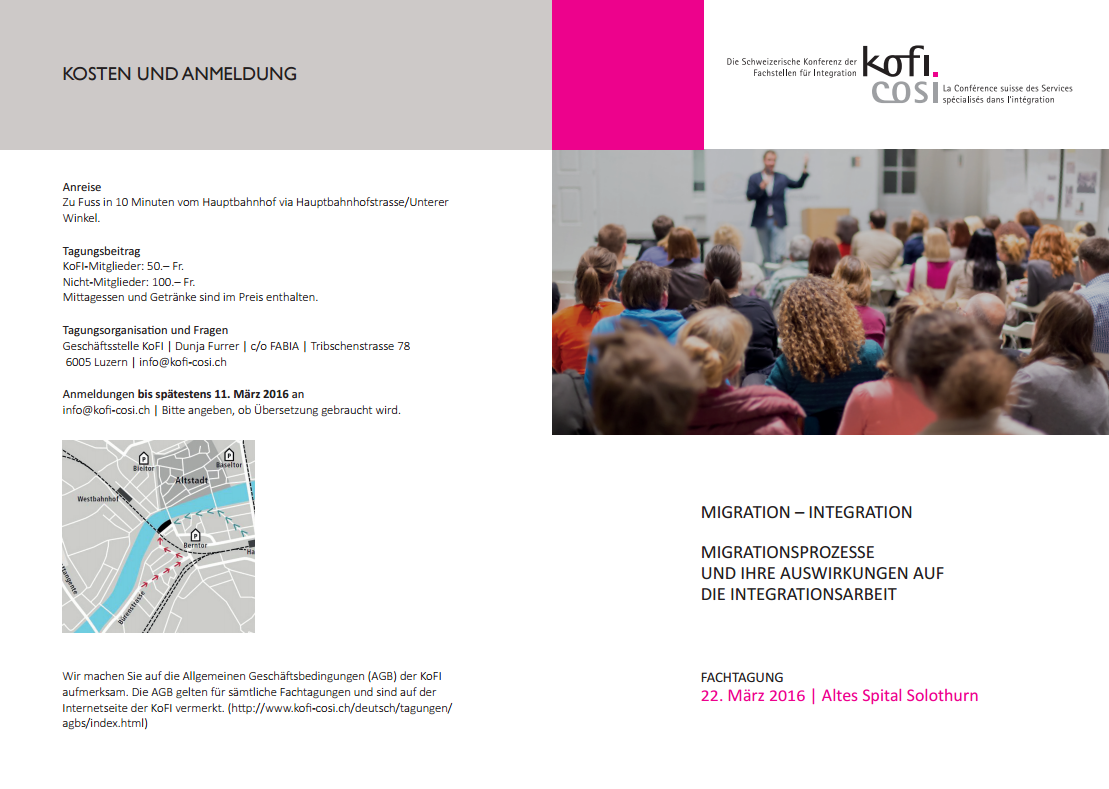 Gerne laden wir Sie ein, an der kommenden Fachtagung der „Schweizerischen Konferenz der Fachstellen für Integration – KoFI“ vom 22. März 2016teilzunehmen und freuen uns über Ihr Interesse am Thema.
