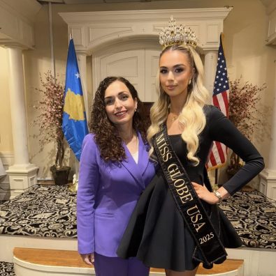 Miss Amerika 2025, Samantha Shkreli Sarelli, bei einer Veranstaltung mit Präsidentin Vjosa Osmani