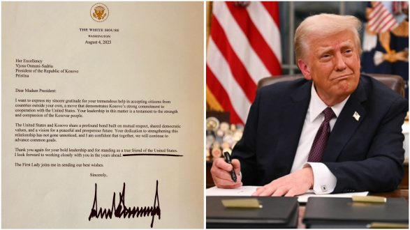 In einem offiziellen Schreiben vom 4. August 2025 hat der ehemalige Präsident der Vereinigten Staaten, Donald J. Trump, seine Dankbarkeit gegenüber der Präsidentin der Republik Kosovo, Vjosa Osmani, zum Ausdruck gebracht. Er lobte darin “die außergewöhnliche Hilfe bei der Aufnahme von Bürgern aus anderen Ländern außerhalb des Kosovo”, berichtet albinfo.ch.