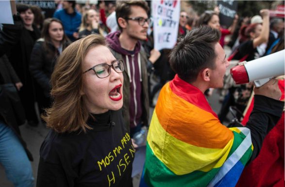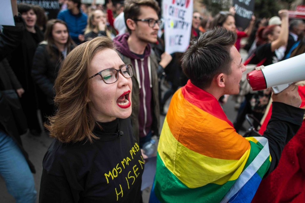 Adelina (links) und Lendi (rechts mit Megafon) gehen in Kosovo für die Rechte von Frauen und der LGBTI-Gemeinschaft auf die Strasse. Foto: Arzije Asani, Céline Stettler