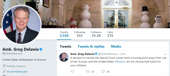 Ambasadori amerikan në Prishtinë, Greg Delawie edhe një herë u ka bërë thirrje deputetëve të Kuvendit që të mos e votojnë ligjin për shfuqizimin e speciales. Ai ka bërë thirrje që të mos zgjedhin gabimisht të ardhmen e vendit.
