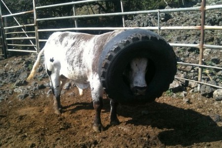 Demat, zakonisht luftojnë me toreadorët, gjegjësisht me pëlhurën e kuqe që ata ua nxjerrin përpara për t`i provokuar. Por, demin nga Honolulu me emrin “Skywalker”, e ka zënë taksirati me një rrotë gome të kamionit.