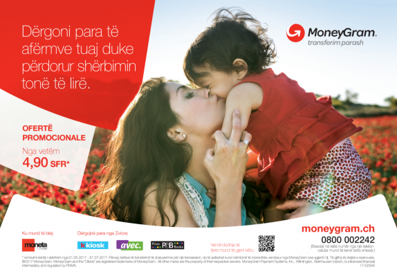 Me MoneyGram ti dhe të dashurit tuaj, jeni gjithmonë në rrugën e duhur. Mbi 350.000 agjentë të shpërndarë nëpër gjithë botën janë në dispozicionin tuaj të plotë. Në Zvicër, ata munden tani të dërgojnë para në rreth 1000 kioske Avec. dhe P & B dyqane. Ju vetëm duhet të regjistrohen në internet që të sigurojnë një kartelë të MoneyGram për të dërguar remitancat e tuaja. Ju duhet të plotësoni në forma kurrë përsëri.