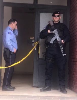 Hyrja e ndërtesës ku ndodhi vrasja është bllokuar nga Policia e Kosovës dhe brenda banesës së mbushur me të vdekur ndodhet edhe forenzika