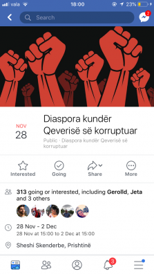 Në llogarinë “Facebook” është krijuar një grup “Diaspora kundër Qeverisë së Korruptuar”, dhe ka paralajmëruar protestë në sheshin Skënderbeu në Prishtinë më 28 nëntor të këtij viti.