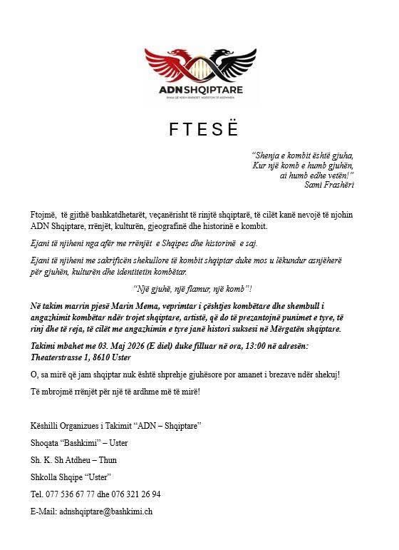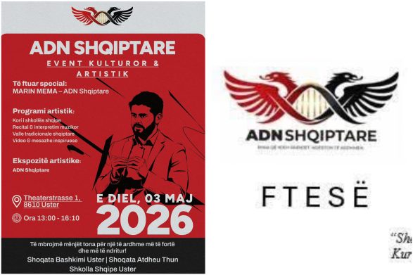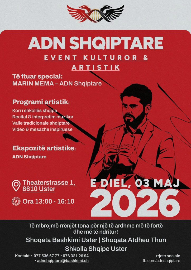 Komuniteti shqiptar në Zvicër vazhdon të dëshmojë përkushtim të madh ndaj ruajtjes së identitetit kombëtar, gjuhës dhe traditave. Me këtë frymë, më 03 maj 2026 (e diel) në qytetin Uster, do të organizohet eventi kulturor dhe artistik me titull “ADN Shqiptare”, një aktivitet i veçantë që synon të promovojë rrënjët dhe vlerat shqiptare në diasporë, transmeteon albinfo.ch.