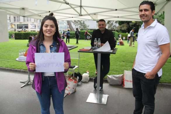 Në pikën shumë të frekuentuar të metropolit zviceran, Cyrihut, aty ku nis rruga më e njohur e qytetit dhe e Zvicrës “Bahnhofstrasse” nuk ke si ta anashkalosh një stendë: sidomos nëse je shqiptar! Një numër të rinjsh dhe të rejash, kryesisht studentë shqiptarë aty kanë “zënë pritën” dhe presin e përcjellin të interesuarit për t`u regjistruar për pjesëmarrje në zgjedhjet e Kosovës që mbahen më 11 qershor. Dhe, në rastet kur harta e Kosovës, si pjesë e logos së zgjedhjeve nuk bën punë, dikush nga këta të rinj del para kalimtarëve në këtë zonë këmbësorësh dhe tërheq vëmendjen duke mbajtur në duar mbishkrimin me pyetjen: “A jeni shqiptarë?”.