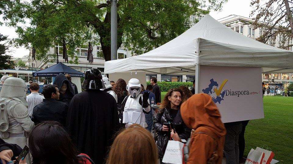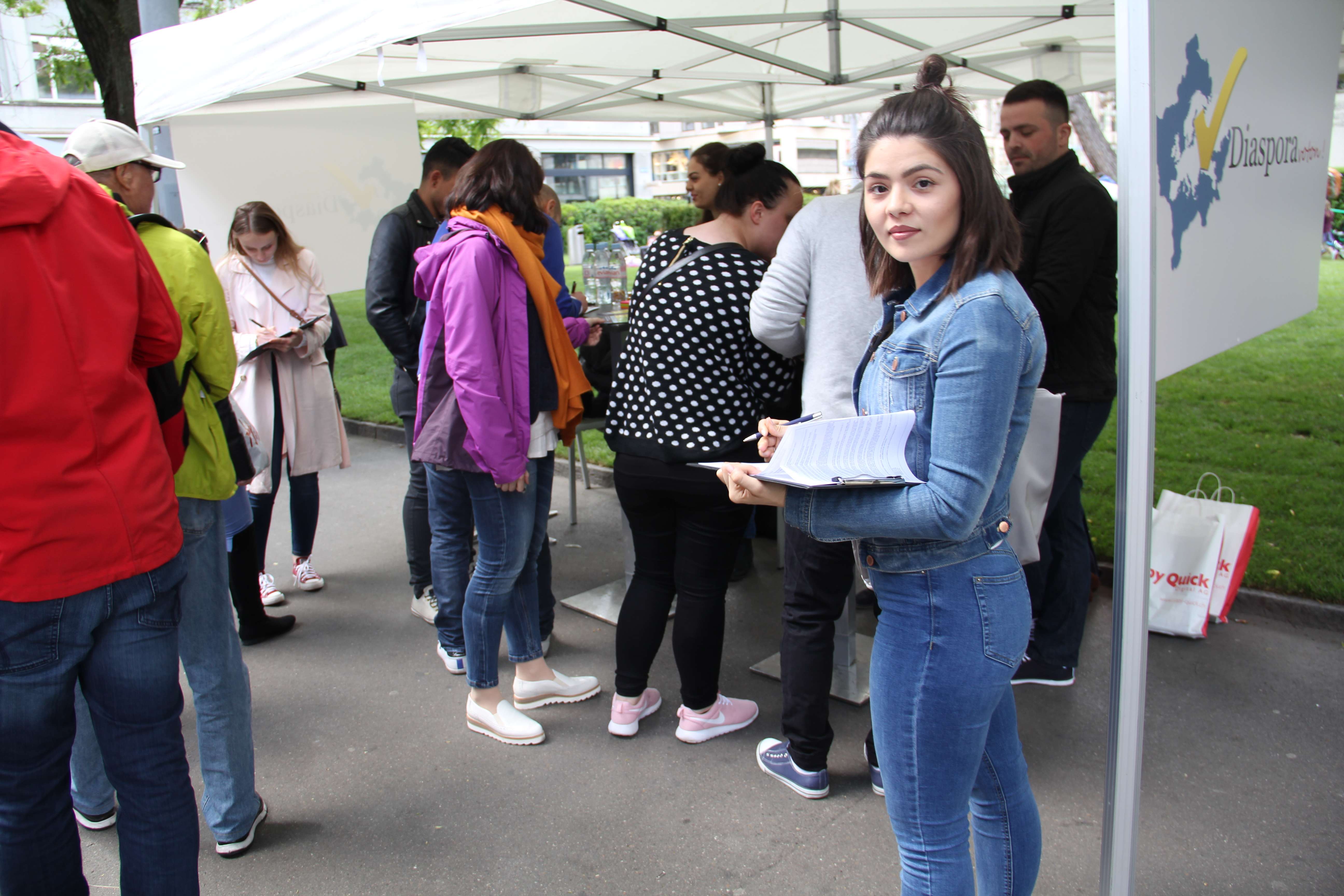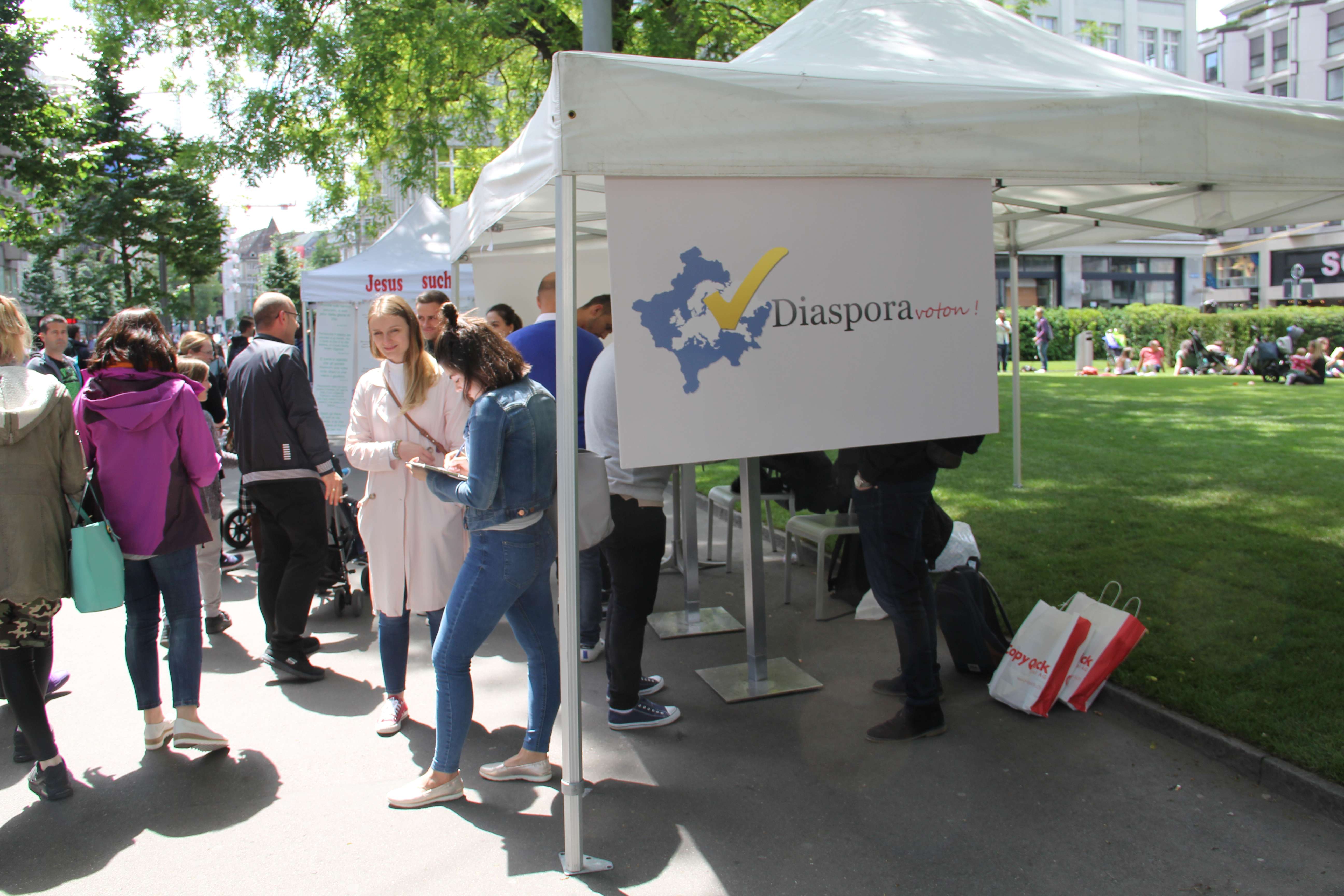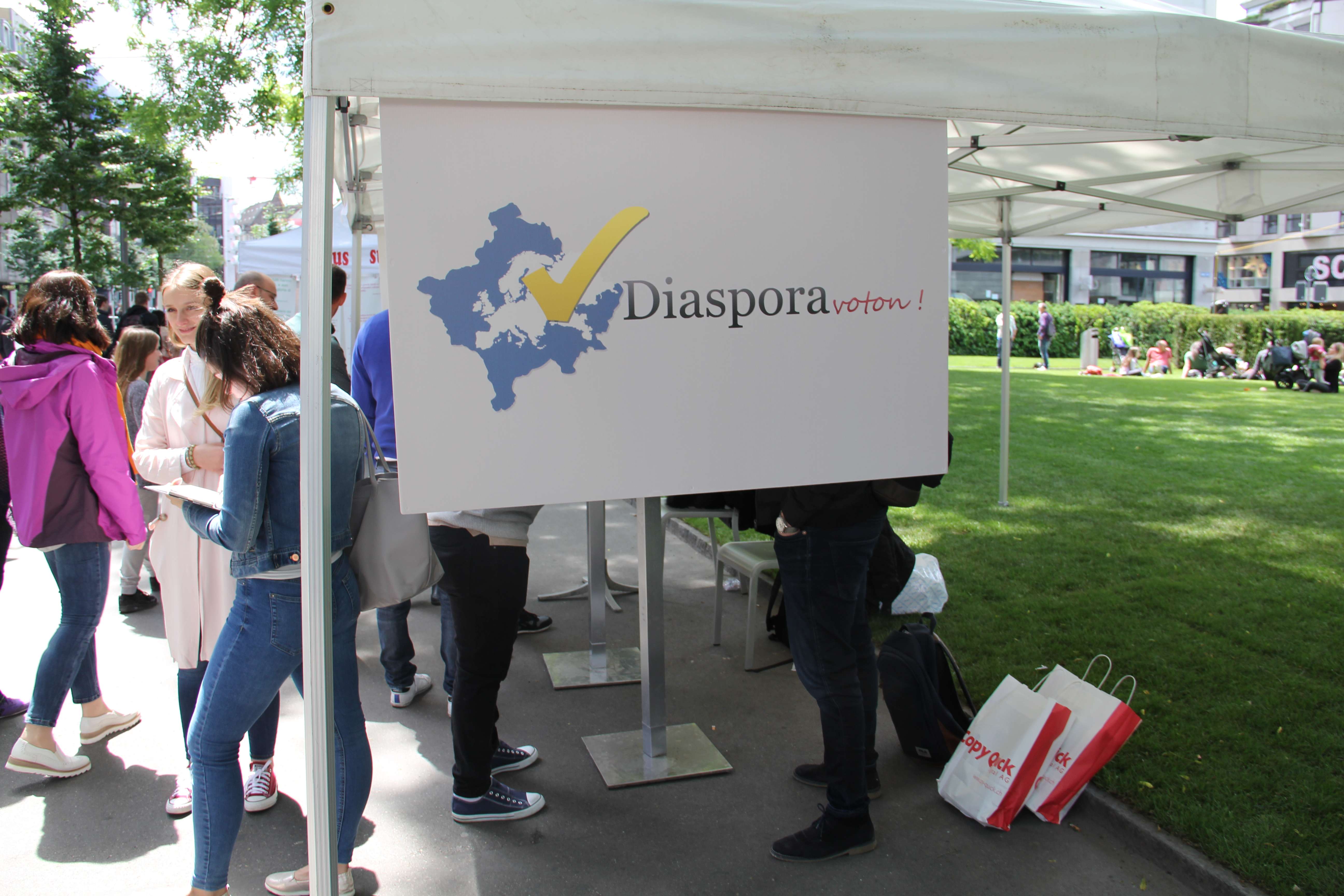 Ky grumbullim simpatik në qendër të Cyrihut është meritë e disa të rinjve që kanë ngritur shoqatën ad-hoc “Diaspora voton”. Qëndrim Smajli, Drilon Kastrati dhe shokë të tjerë, duke dashur të sensibilizojnë mërgatën me zgjedhjet e pritshme, kanë ndërmarrë iniciativën që rezultoi e frytshme. Pastaj, aksionit fillimisht apartiak i janë bashkuar edhe aktivistët e Lëvizjes Vetëvendosje. Siç thotë për albinfo.ch aktivistja e kësaj lëvizjeje, Njomëza Gutaj, ky aksion “na u duk interesant dhe nuk hezituam që të përkrahim iniciatorët e tij. Për ta “mbajtur në këmbë” një stendë të tillë gjatë gjithë ditës (nga ora 6 e mëngjesit deri në orën 20 të mbrëmjes) nevojitet një numër i konsiderueshëm vullnetarësh, prandaj u vumë në dispozicion këtij aksioni”, thotë znj. Gutaj, e cila edhe vetë është ndër më të angazhuarat rreth stendës. Por, aty nuk ka rëndësi më kush, çfarë orientimi politik ka.
