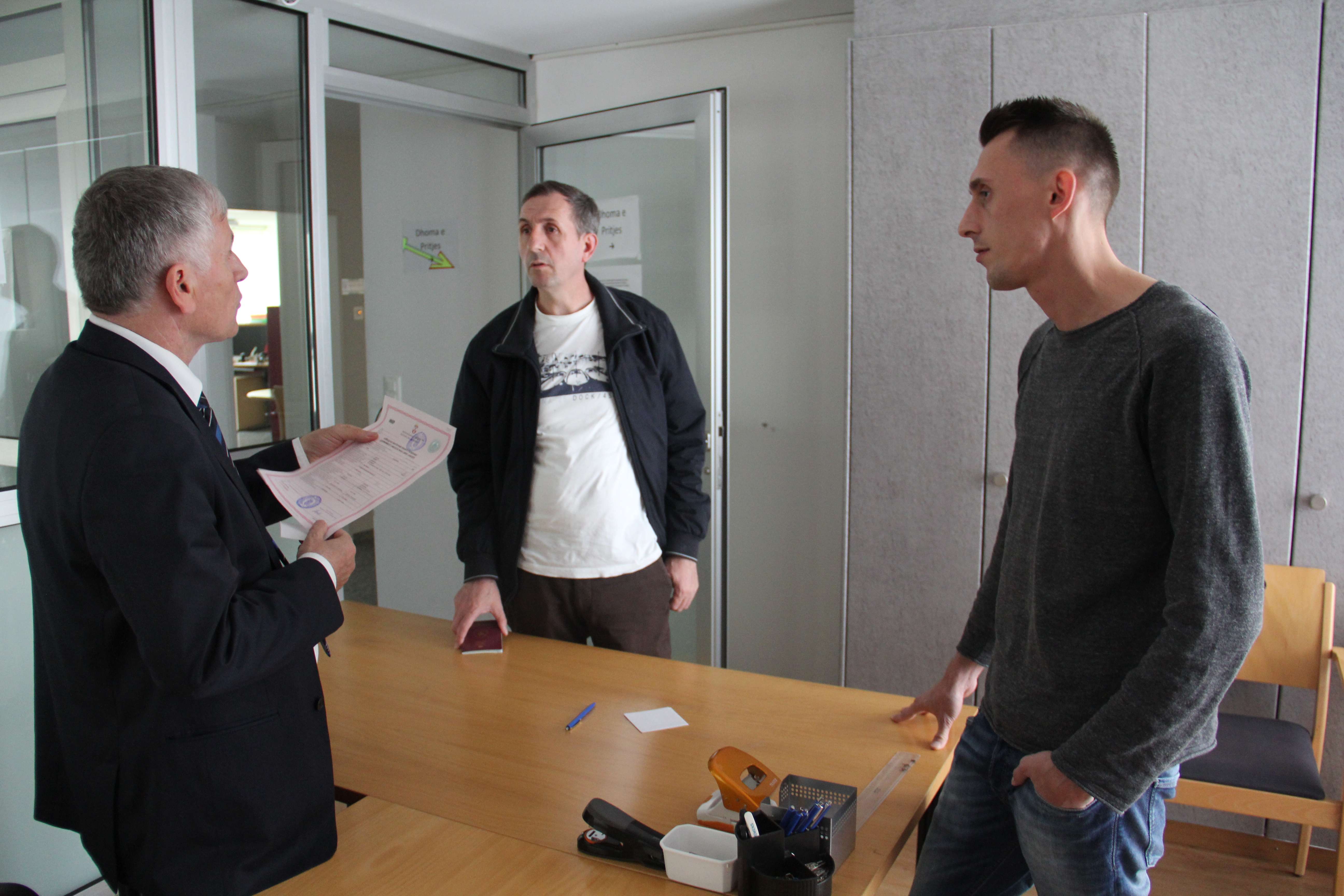 Ndërkohë aty vijnë njëri pas tjetrit disa mërgimtarë. I riu Ardian Morina, nga Rahoveci me djalin e tij të vogël ka ardhur për të bërë regjistrimin për votim. Ai ka mbaruar shkencat politike në Prishtinë dhe pak vite më parë ka ardhur për të jetuar në Zvicër. Ndërsa Sabedin Shabani nga Gjilani së bashku me djalin e tij, Albanin, kanë ardhur për t`u konsultuar për votim por njëherësh edhe për t`u interesuar se si mund të bëhet Albani qytetar i Kosovës. “Unë jam rritur këtu ndërsa i lindur jam në Dobrosin, komuna e Bujanocit”, thotë ai. Kështu që deri tash nuk kam dokumente kosovare edhe pse familja ka kaluar të jetojë në Gjilan që nga viti 1999”.