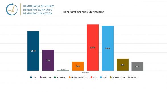 Sipas DV-së, pas VV me përqindje më të madhe të votave renditet Lidhja Demokratike e Kosovës (LDK) 24.68 % dhe Partia Demokratike e Kosovës me 21,78%.