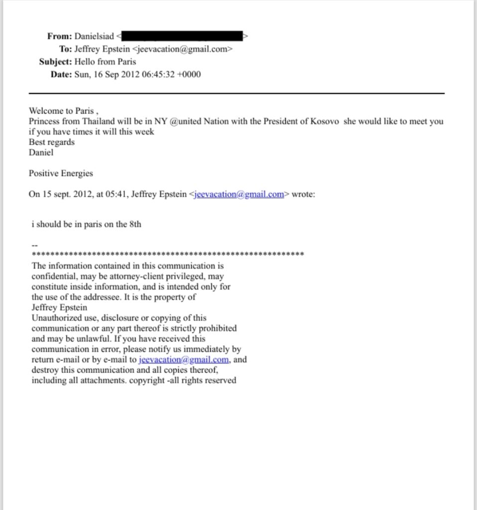 Një e-mail i vitit 2012, dërguar nga një person me emrin “Daniel”, përmend një takim të mundshëm në New York mes Jahjagës dhe një princeshe nga Tajlanda: