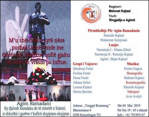 Në 20 vjetorin e rënies së poetit, artistit, piktorit, strategut, komandantit, heroit të kombit Agim Ramadani-Katana QSHKI “BESA” shfaq dramën “RINGJALLJA E AGIMIT”, në regjinë e Mehmet Kajtazit.