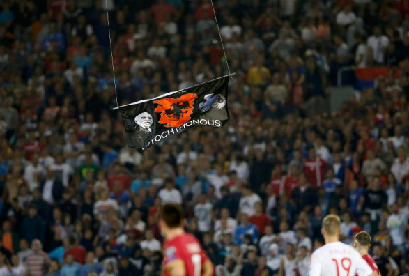 Tifozët serbë kanë shprehur urrejtje të egër ndaj shqiptarëve, duke hedhur petarde dhe gjësende të forta në fushën e lojës, si dhe një flamur i NATO-s është djegur.