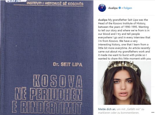 E njohur si një këngëtare që në asnjë rast nuk e mohon përkatësinë e saj shqiptare dhe kosovare, Dua Lipa, ka dhënë edhe një dëshmi në këtë drejtim. Ajo, në rrjetin social Instagram ka publikuar sot librin e gjyshit të saj, historianit të njohur, të ndjerë, Seit Lipa, “Kosova në periudhën e rindërtimit” dhe një përkushtim për të.