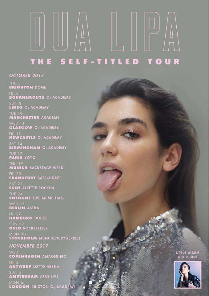 Por, Dua Lipa nuk e ka ndërmend të ndalet. Ajo nga muaji tetor do të ketë edhe një turne në disa qytete evropiane si Brighton, Lids, Mançester, Glasgou, Paris, Munih, Frankfurt, Koln, Berlin, Hamburg, Oslo, Stokholm, Kopenhagë, Amsterdam dhe Londër.