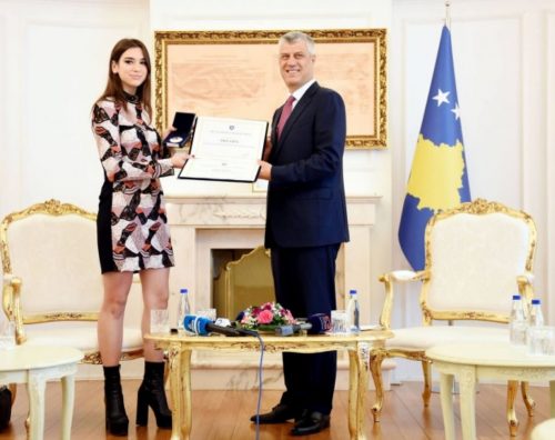 Këngëtaren Dua Lipa, presidenti Thaçi e ka dekoruar me Medaljen Presidenciale të Meritave.