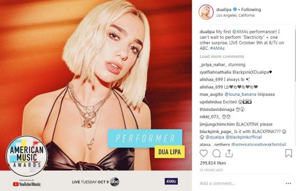 “Performaca ime e parë në AMAs. Meszi po pres të performoj “Electricity” si edhe një tjetër surprizë”, ka shkruar ajo. Dua Lipa është nominuar në AMA-s për çmimin ‘Artistja e re e vitit’.