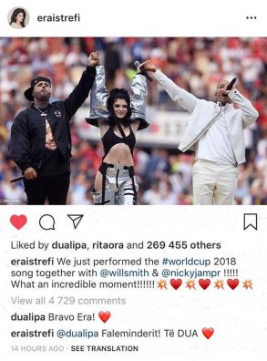 Dua Lipa është e vetmja këngëtare me famë botërore që mbështeti Era Istrefi për performancën në stadiumin e Luzhniki të Moskës. Ajo këndoi këngën ‘Live it up’ me Will Smith dhe Nicky Jam.