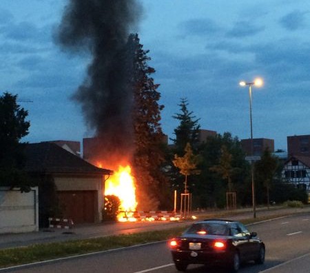 Dy meshkuj kanë humbur jetën duke mbetur të djegur në veturën Mercedes Benz e cila kishte shpërthyer në zjarr pasi që ishte pe¨rplasur fuqishëm në një mur shtëpie afër rruges.