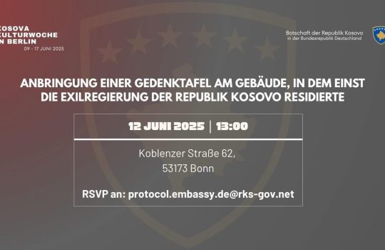 - Ceremonia e zbulimit të pllakatës në ndërtesën ku ishte e vendosur Qeveria në ekzil të Kosovës në qytetin e Bonn-itNë Gjermani do të mbahet ceremonia e zbulimit të pllakatës në...