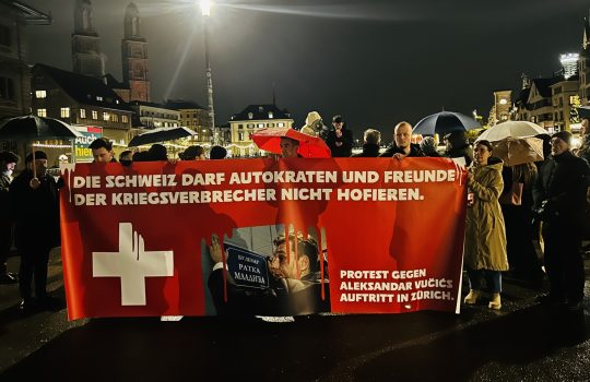 - U protestua kundër pritjes së presidentit serb, Vuçiq, në CyrihNë një mot të ftohtë dhe me shi, u shpalos pankarta...