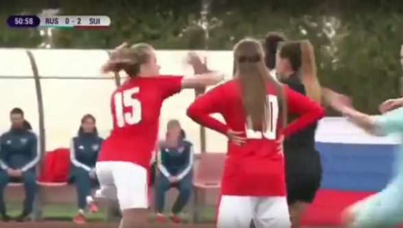 Bit of tasty action from the Women’s U17 Euro qualifiers – Swiss captain Ella Ljustina (red) kicks Russian skipper Zhoze-Diana Pamen Tchato from behind, then runs off when she gets lamped back and cries when she gets sent off ???? pic.twitter.com/5EHdKDWB1M