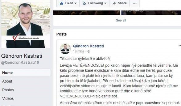 “Atmosfera që mbizotëron midis nesh është e papranueshme sepse nuk i ngjan aspak ambientit të Lëvizjes që ne e njohim. Sharjet e fyerjet midis nesh nuk i kontribuojnë zgjidhjes së problemit. Prandaj, ato duhet ndaluar sa më parë. Kush i gëzohet dorëheqjes se aktivistëve, nuk i kontribuon Lëvizjes dhe askujt brenda Lëvizjes, pavarësisht qëndrimeve që mund të kesh mbi arsyet e tyre. Së paku, ata po dorëhiqen dhe dorëheqja meriton respekt. Kontributin e tyre nuk mund ta marrë era nëse ke pasur mospajtime vitin e fundit”, ka shkruar Kasrati.
