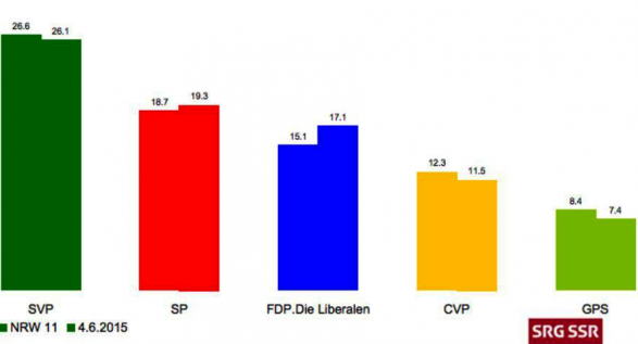 Sipas këtij barometri, po të mbaheshin zgjedhjet në fund të gushtit, partitë si SVP/UDC dhe FDP/PLR do të dilnin me një përqindje të shtuar të votave, ndryshe nga partitë e qendrës si CVP/PDC, BDP dhe GLP të cilat kanë një rënie të theksuar.