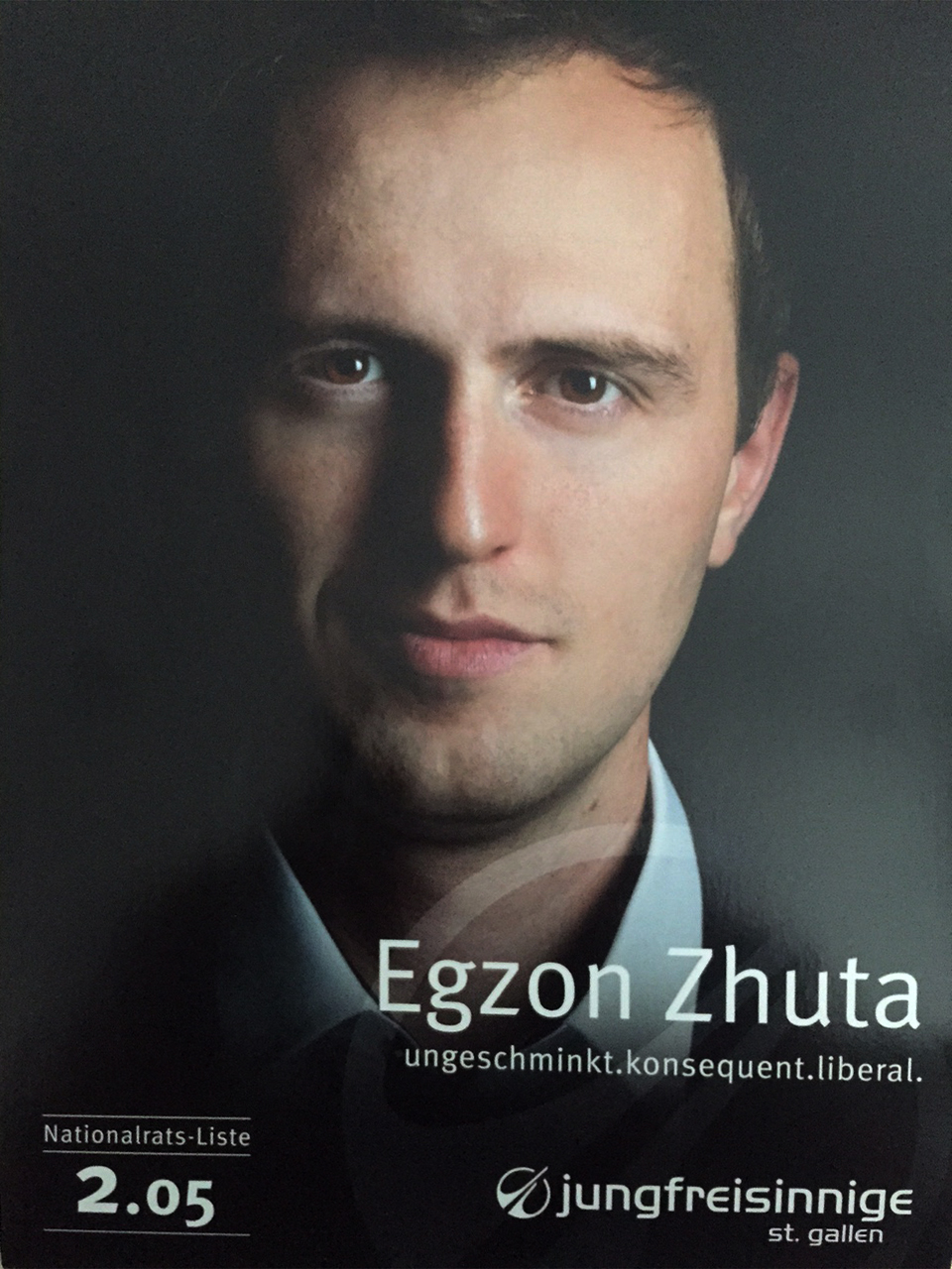 Egzon Zhuta është kandidat tipik i partisë që përfaqëson, FDP-së. Ai bart vlerat në të cilat mbështetet kjo parti, si liberalizmi në ekonomi, vetiniciativa dhe mosvarja nga shteti. Si i tillë, Egzon Zhuta thotë se as integrii i të huajve nuk duhet të jetë barrë e shtetit por e atij që do të integrohet.
