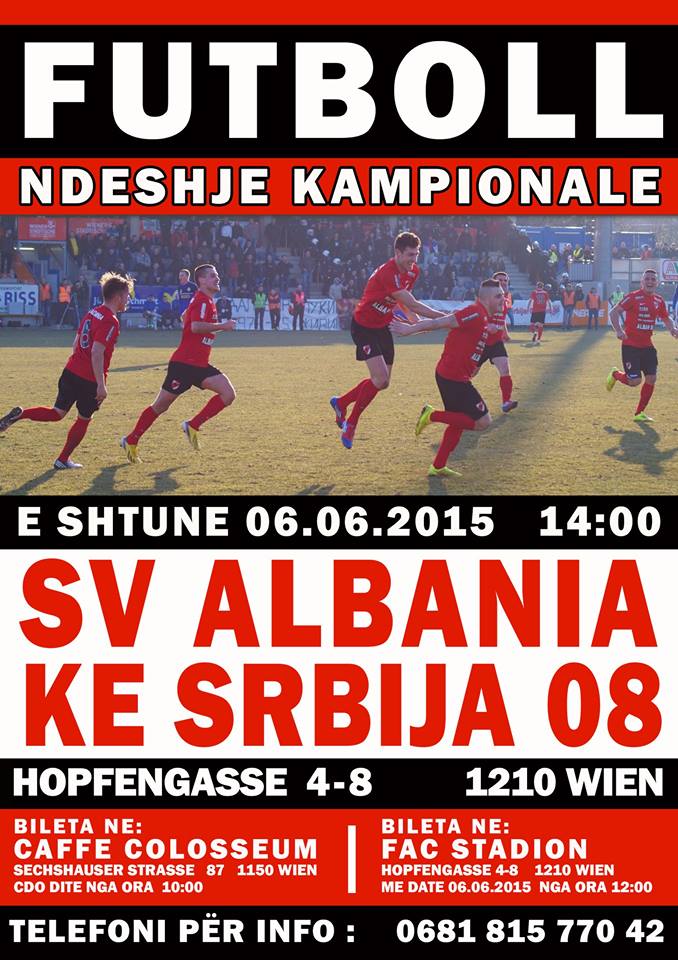 Ndeshja e kthimit mes skuadrës shqiptare “SV Albania” dhe asaj serbe “SC Kaiserebersdorf –Serbia” do të zhvillohet të shtunën, më 06.06, në orën 14:00, në Vjenë të Austrisë.