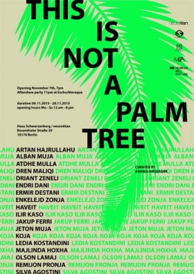 Artistë rinj nga Shqipëria dhe Kosova ekspozojnë në Berlin punimet e tyre në një ekspozitë kolekive tematike të titulluar “This is not a Palm Tree” (Ky nuk është një dru palme). Pjesëmarrës të ekspozitës që do të qëndrojë e hapur nga 7 deri më 28 nëtor 2015 janë artistët: Alban Muja, Artan Hajrullahu, Atdhe Mulla, Dren Maliqi, Driant Zeneli, Endri Dani, Enkelejd Zonja, grupi «Haveit», Ilir Kaso, Jakup Ferri, Jeton Muja, Koja , Ledia Kostandini, Majlinda Hoxha, Olson Lamaj, Remijon Pronja dhe Silva Agostini.
