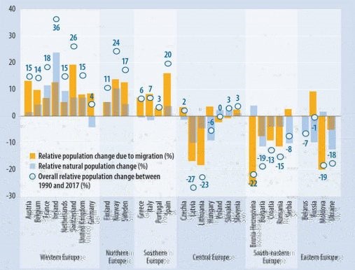 Nga 1990 vendet e si Bullgaria, Letonia, Lituania, Moldavia, Bosnja dhe Hercegovina dhe Rumania kanë humbur 19 përqind ose më shumë të popullatës. Letonia ka humbur plot 27 për qind.