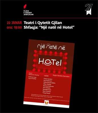 Bashkim Nexhipi, koordinator i “Flakës së Janarit 2018”, ka thënë se kështu, në natën e parë, më 22 janar, që është edhe mbrëmje hapëse, të parët do të paraqiten vendësit, Teatri i Gjilanit, i cili do të japë shfaqjen “Një natë në hotel”, me tekst të Muharrem Shahiqit, me dramatizim të Agush Mulliqit e në regji të Bashkim Ramadanit, përcjell albinfo.ch.