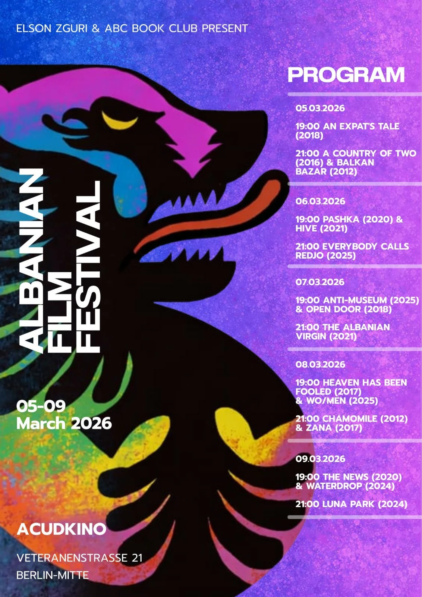 Festivali do të organizohet në ACUD Kino, një nga hapësirat më ikonike dhe të pavarura kulturore të Berlinit, duke u konsideruar si një mundësi unike për bashkimin e regjisorëve, dashamirësve të filmit dhe publikut ndërkombëtar rreth rrëfimit shqiptar në ekranin e madh.