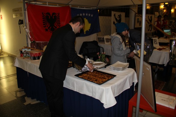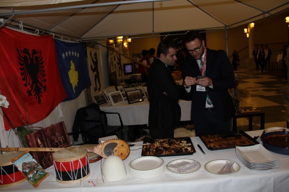 Në mesin e stendave me gjësende dhe ushqime karakteristike të komuniteteve ishte edhe ajo e shqiptarëve, gjegjësisht stenda e përbashkët e Shqipërisë dhe Kosovës. Në këtë stendë ishin ekspozuar instrumente muzikore shqiptare, broshura e kartolina me përmbajtje nga historia e shqiptarëve si dhe disa specialitete të kuzhinës.