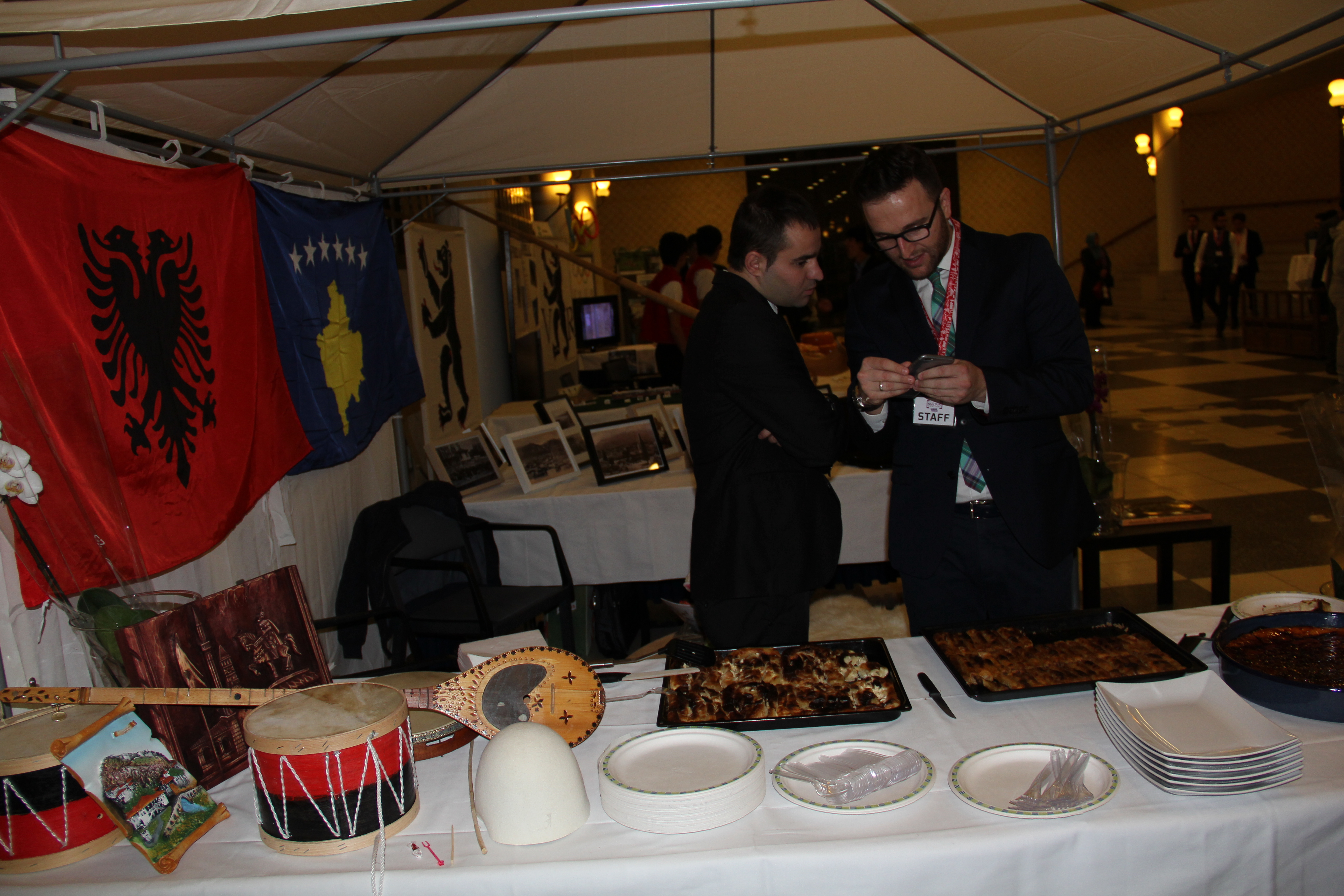 Në mesin e stendave me gjësende dhe ushqime karakteristike të komuniteteve ishte edhe ajo e shqiptarëve, gjegjësisht stenda e përbashkët e Shqipërisë dhe Kosovës. Në këtë stendë ishin ekspozuar instrumente muzikore shqiptare, broshura e kartolina me përmbajtje nga historia e shqiptarëve si dhe disa specialitete të kuzhinës.