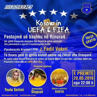 Nesër mbrëma në diskotekën “Rinora 4” në Rümlang të Zvicrës do të organizohet një mbrëmje solemne për të festuar pranimin në UEFA dhe FIFA të Kosovës.
