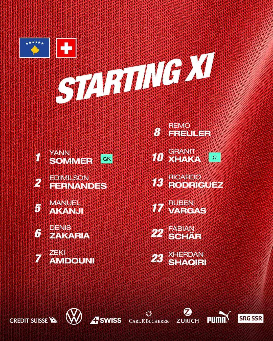 Sa i përket ekipit kundërshtar të Kosovës për sonte, Zvicrës startojnë dyshja shqiptare Granit Xhaka dhe Xherdan Shaqiri, teksa pjesa tjetër përbëhet nga Sommer, Fernandes, Akanji, Zakaria, Amdouni, Freuler, Rodriguez, Vargas dhe Schar.