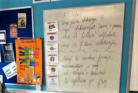 Po ashtu, në këtë fotografi shihet tabela ku janë shkruar fjalë shqipe dhe po mësohet shkronja e parë e alfabetit shqip.