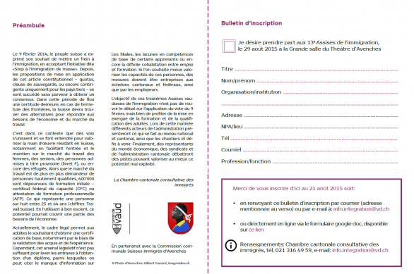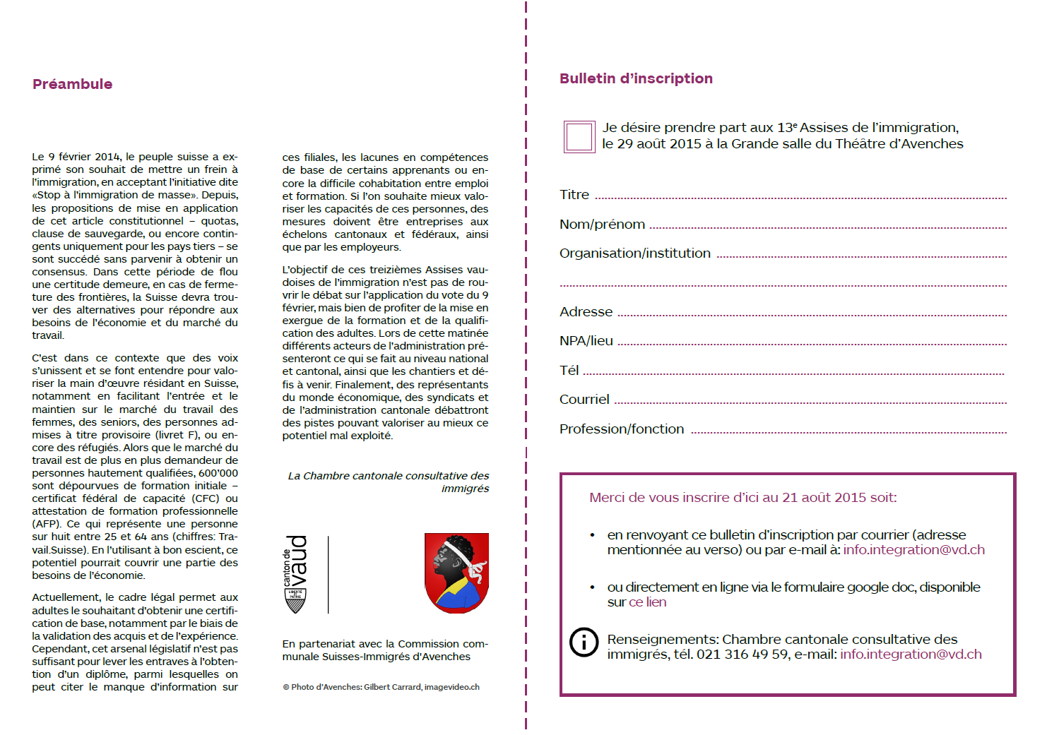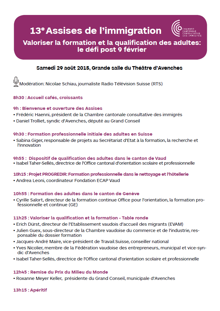 La Chambre Cantonale Consultative des Immigrés (CCCI) a le plaisir de vous inviter aux 13èmes Assises vaudoises de l’immigration, qui se tiendront le 29 août 2015 à la Grande salle du théâtre d’Avenches. Cette édition, mise sur pied en partenariat avec la Commission communale Suisses-Immigrés d’Avenches, s’intitule «Valoriser la formation et la qualification des adultes : le défi post 9 février ».