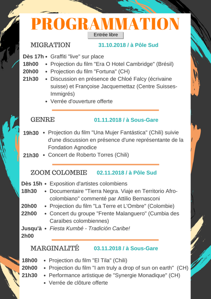 Le FOL est une rencontre artistique et engagée, rassemblant nouveaux.elles réalisateurs.trices latino-américains.es et suisses, chercheurs.euses et étudiants.es en sciences sociales, artistes, écrivains.es, activistes et le public autour d’une programmation de films suisses et latino-américains, de débats et de concerts. Les projections seront accompagnées de débats afin de créer un espace de discussion autour de thématiques sociales touchant nos sociétés de manière transversale et permettant ainsi d’ouvrir un dialogue interculturel.